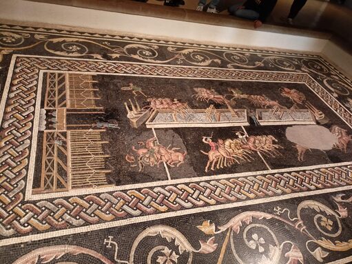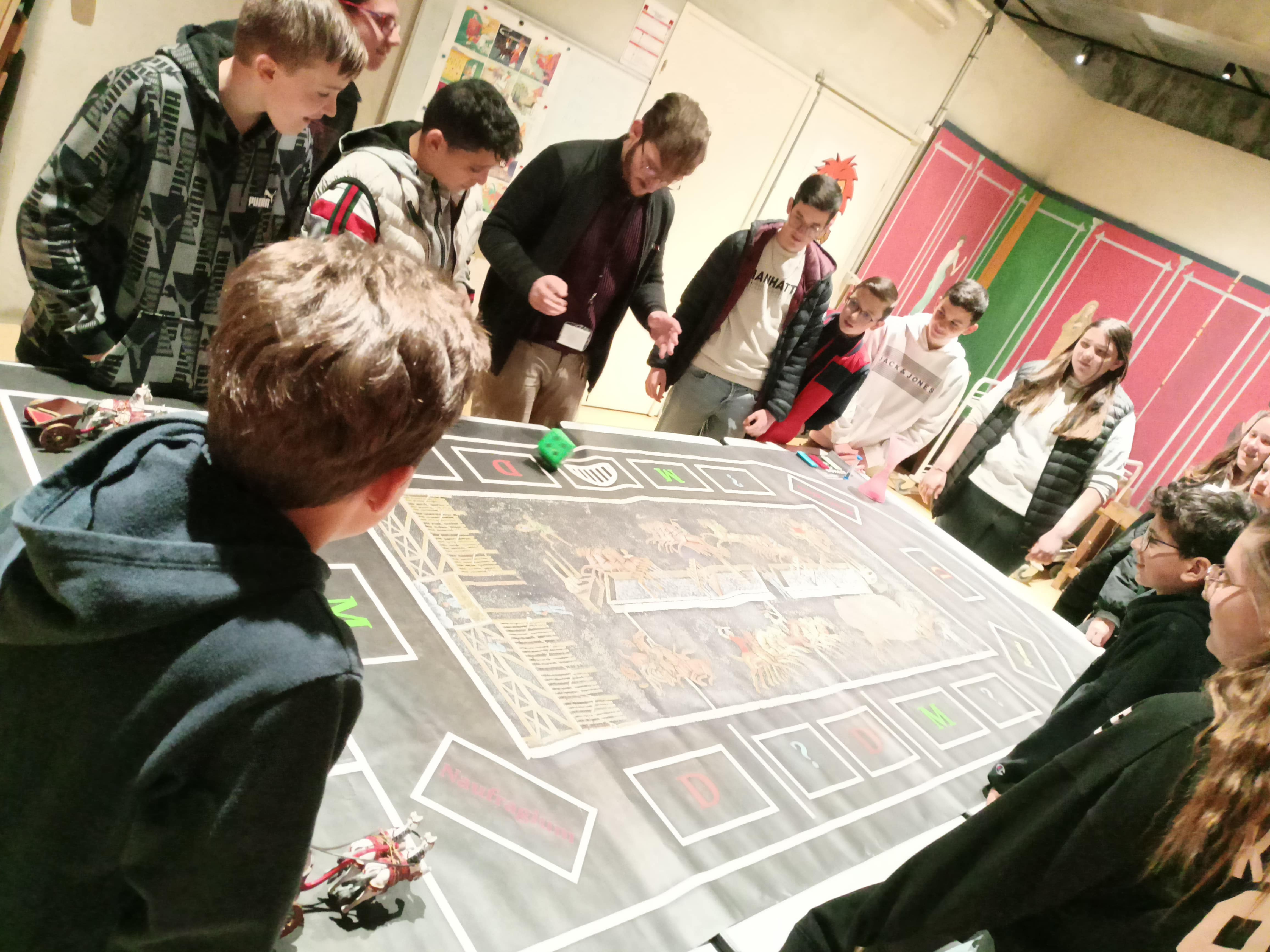 Les 4èmes accompagnés de Mme Mercier avaient un atelier autour des jeux du cirque : après la découverte et analyse de la fameuse mosaïque de "la course de chars", jeu de société géant ! 4 équipes se sont affrontées autour de mimes, de dessins et de questions afin de réaliser le plus grand nombre de tours !